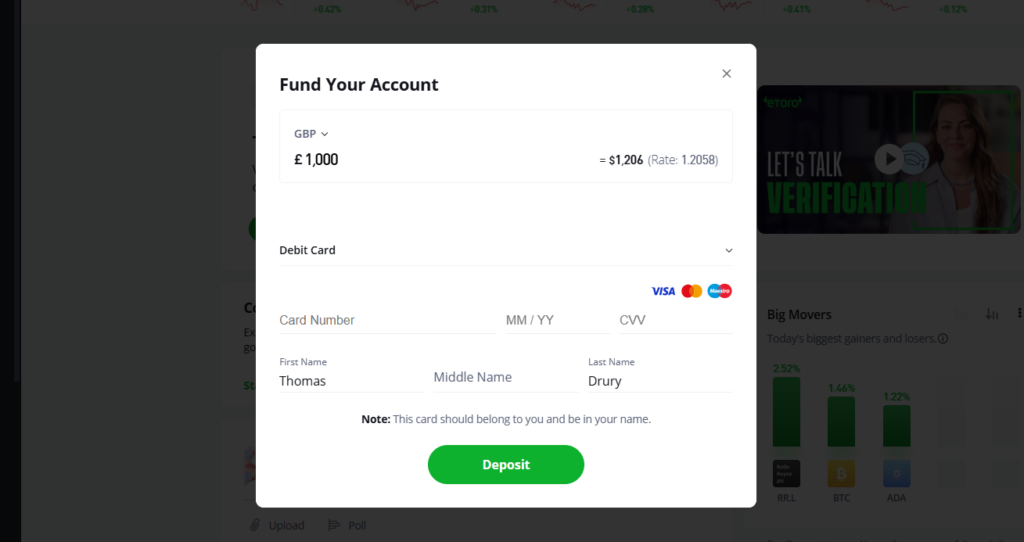 Once my eToro account was verified, the next step was to fund it. Thankfully, eToro gives UK users a few flexible options, and I’ve tested out most of them over the past couple of years.